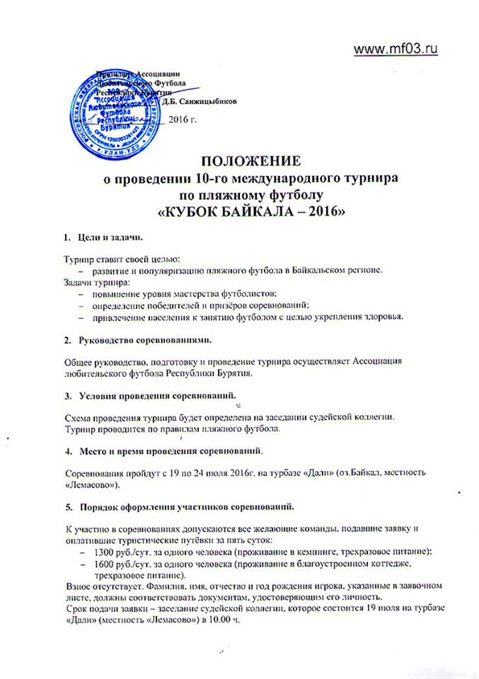 С 19 по 24 июля 2016 года на берегу озера Байкал (местность Лемасово) пройдет 10-й ежегодный международный турнир по пляжному футболу «Кубок Байкала». В турнире примут участие команды Сибири, Китая и Монголии.