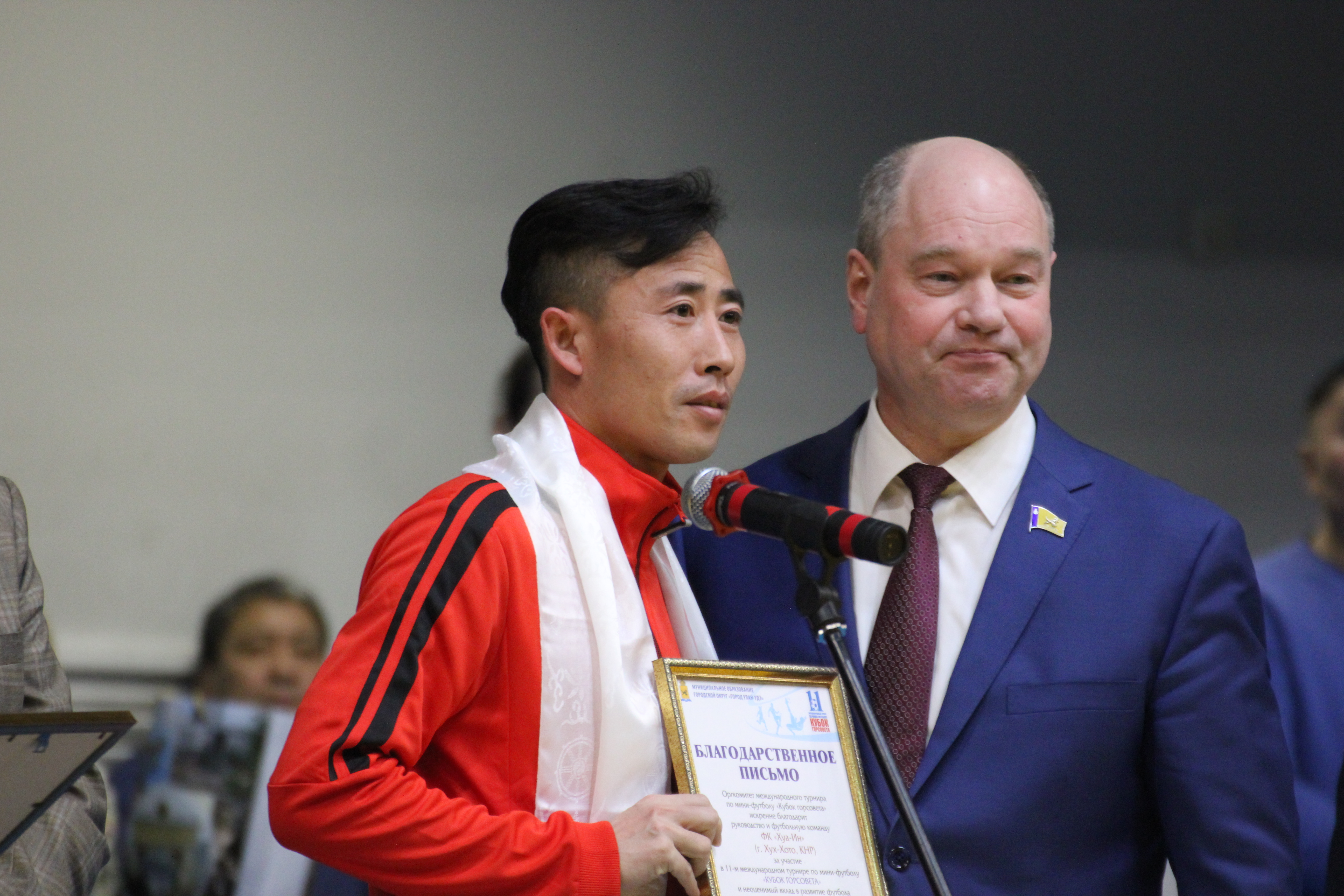 Почетные гости турнира из Монголии и Китая - начальник Управления спорта Китайской Народной Республики Тенг Ан Чжун, заслуженный судья по футболу Китайской Народной Республики Лу Сяо Мин, директор спортивного центра по футболу Управления физической культуры и спорта города Хух-Хото Лю Юн, начальник отделения Управления физической культуры и спорта города Хух-Хото Дун Жуй, начальник Управления физической культуры и спорта города Маньчжурия – Сю Вэй, тренер национальной сборной команды Монголии г-н Эрдэнэ-Очир и президент футбольного клуба «Дэрэн» господин Монхчулуун.
